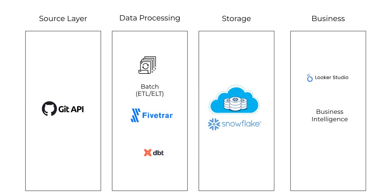 GitHub stores data about code projects. The GitHub API lets us access this data. Fivetran has a connector that pulls this data for us.